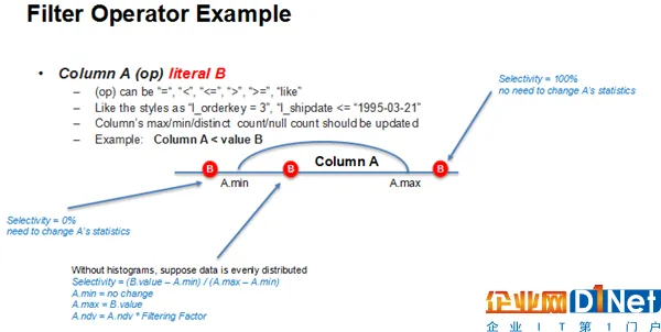 如下图,为一个A小于等于某数字的估算,如果A的value比A的最小值更小,或者是比A的最大值更大,那么过滤率肯定是0或者100%,当落在定义域中间的时候,假设是均匀分布,概率则是A.min到B的区间所占A的定义域的百分比,这个是Filter条件最终的selectivity,有了selectivity,即可再相应的更新filter以后的统计信息。