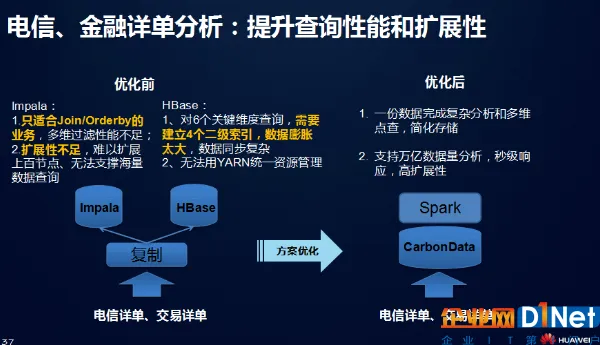 成功案例介绍随后,李昆通过电信详单分析场景的举例介绍,详细说明CarbonData如何以一份数据支持多种应用场景的。李昆表示,在电信跟金融领域经常需要明细数据分析,优化之前,老的系统需要用Impala和Hbase两个系统,建立4个二级索引才可以完成业务需要的性能。这其中,Impala用来做报表输出,Hbase做关键维度查询。这两个系统有各自存在不足:Impala没有办法很好的扩展,HBase要做很多二级索引,无法使用yarn统一资源管理,只能是一个个集群单独维护。