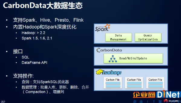 CarbonData大数据生态Carbondata在数据查询方面选择和Spark结合,据李昆现场介绍,Carbondata+Spark可以打造一个相对于传统系统来说,更好的交互分析体验,目前Carbondata和Spark1.5、1.6、2.1,Hive,Presto都做了集成,未来还将对Spark2.2做支持;在接口方面,Carbondata提供SQL接口,也支持Spark DataFrame API;在操作方面,支持查询、数据管理如批量入库、更新、删除等操作。