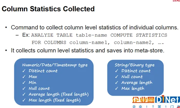 第一步收集、推断和传播关于源/中间数据的表/列统计信息。用户运行 ANALYZE TABLE 命令会收集表格信息比如表的行数、大小,列的统计信息比如最大值、最小值、不同值个数等,并将这些信息存储到metastore里面。