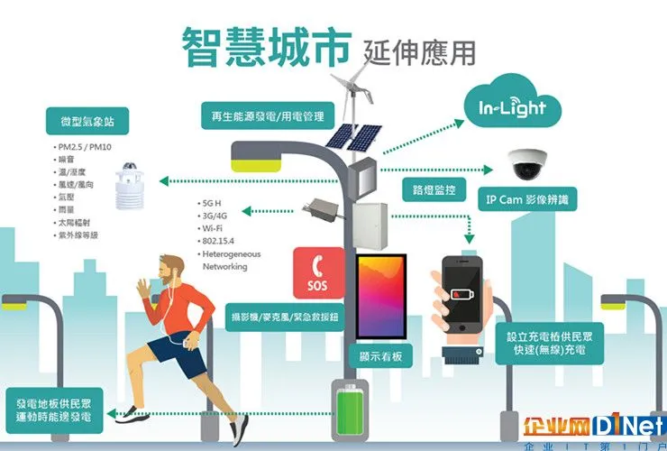 智慧城市充分运用感测、移动网络与云计算等技术,整合城市关键信息并进行分析,以解决交通环境、公共安全、工商业服务等需求,因此需要一个信息收集、处理的物联网终端设备,而路灯具有位置优势及供电系统两大优势,可解决物联网设备的两个最大问题:布点及供电。