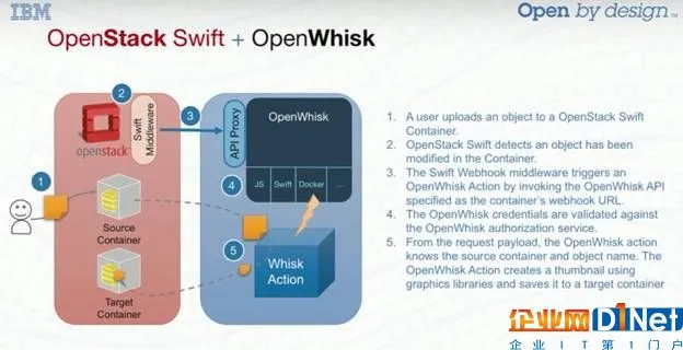 OpenWhisk是在OpenStack波士顿峰会上展示的IBM项目。该项目是开源的,可以认为它正在寻求成为现代数据中心的OpenStack(也可能是内部部署)云上无服务器的实际标准解决方案。在波士顿会议中呈现的示例是文件上传到Swift的具体场景,然后会在OpenWhisk上触发一个功能: