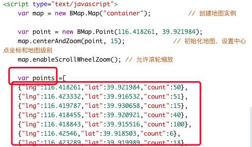百度地图提供了很多API使用示例,有HTML基础,有JS基础就可以尝试改函数了。仔细观察源代码,可以知道热力图的生成主要的数据都存放在points这个变量中。