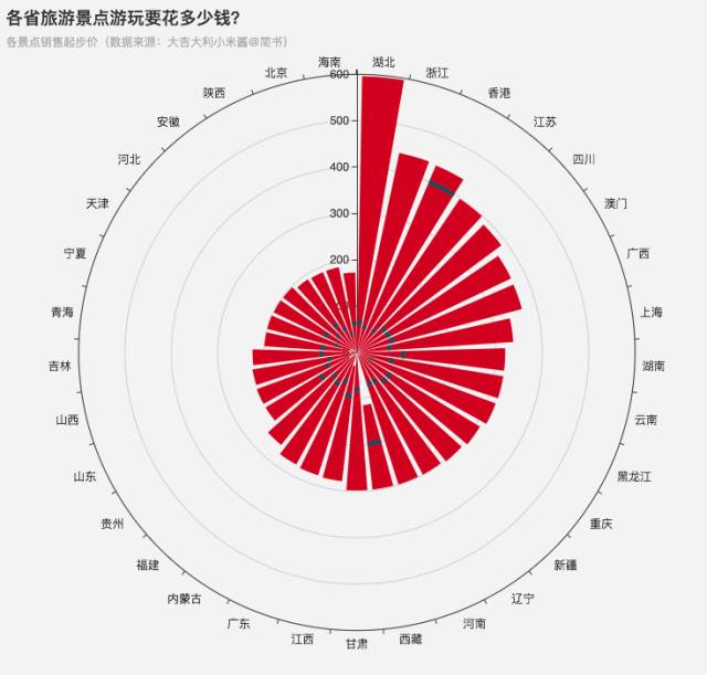 既然去哪些地方人多,去哪里景多都已经知道了,那再看看去哪些地方烧得钱最多吧?下图是由各城市景点销售起步价的最大值-最小值扇形组成的圆,其中湖北以单景点销售起步价600占据首位,但也可以看到,湖北的景点销售均价并不高(在红色扇形中的藏蓝色线条)。而如果国庆去香港玩,请做好钱包减肥的心理和生理准备。