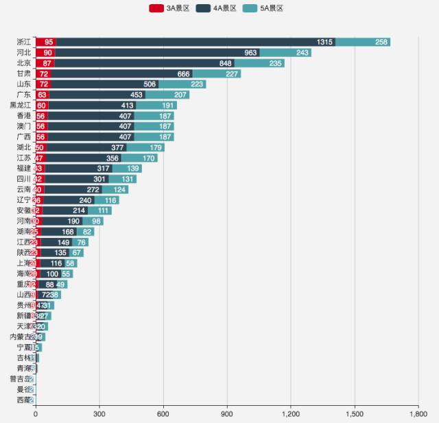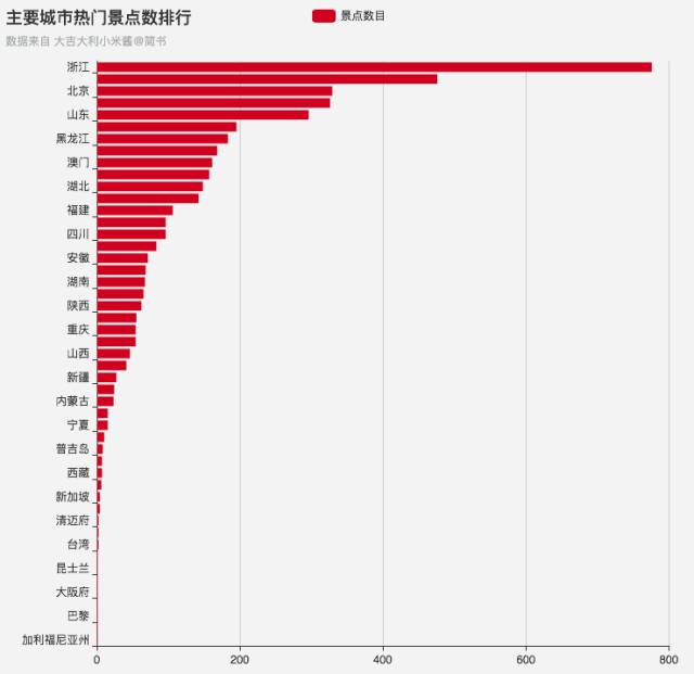 于是我又做了一个各城市包含热门景点数目的排行,没想到在4千多个热门景点中,数目最多的竟是浙江,是第二个城市的1.5倍,而北京作为首都位居第二。