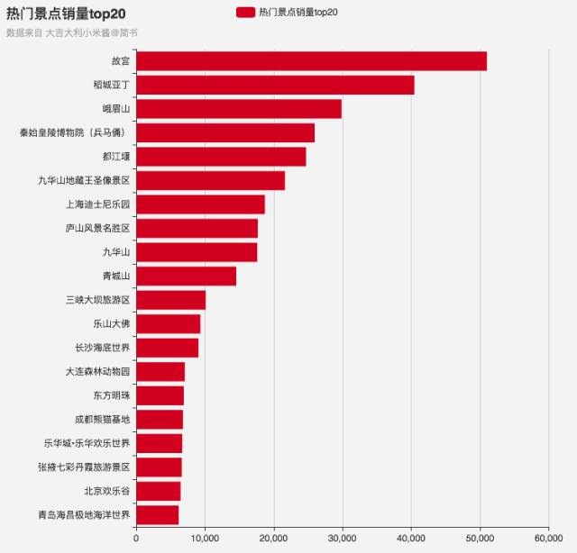 将地图上热门景点的销量Top20提取出来,大多数都是耳熟能详的地点,帝都的故宫排在了第一位,四川则占据了Top5中的三位,而排在Top20中四川省就占了6位,如果不是因为地震,我想还会有更多的火爆的景点进入排行榜的。这样看来如果你这次国庆打算去四川的话,可以脑补到的场景就是:人人人人人人人人人……