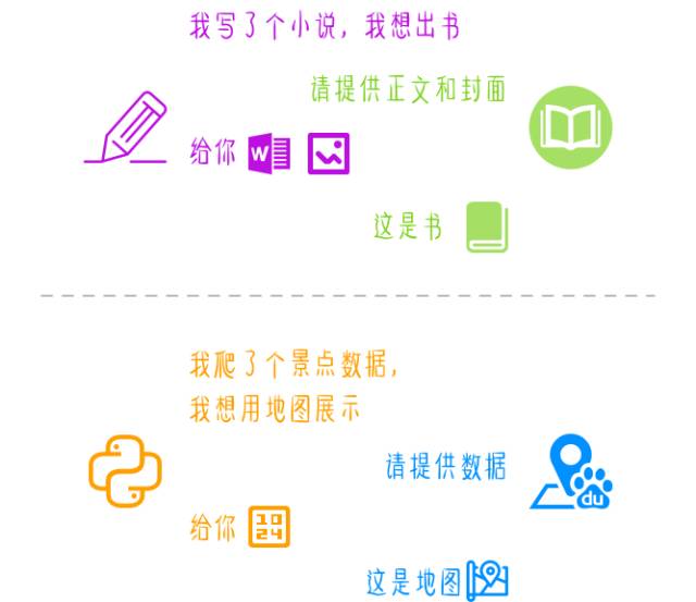 而具体流程如下,好比出书的过程,想要将完结的小说出书,首先要通过出版社的出版服务,提供正文内容和封面设计图,将保存好的 word 文本和封面图发给出版社,由此得到一本书。在此过程中,并不需要了解出版社印刷、装订的过程。