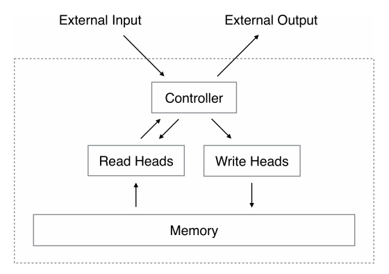 NTM架构如上所示。 在每个更新周期期间,控制器网络接收来自外部环境的输入并作为响应发出输出。 它还通过一组并行读写头读取和写入存储器矩阵。 虚线表示NTM电路与外界的划分。摘自Neural Turing Machines,2014年