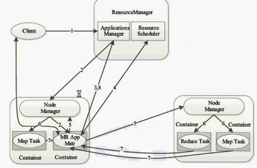 YARN的ResourceManager将会发布ApplicationMaster(按照指定的)。然后ApplicationMaster将会采用ApplicationMasterProtocol与ResourceManager 进行通讯,首先ApplicationMaster会使用ApplicationMasterProtocol#allocate方法注册自己到ResourceManager.为了完成指定的任务。ApplicationMaster要通过ApplicationMasterProtocol#allocate来请求和接收containers。在一个container分配给他之后,ApplicationMaster使用ContainerManager#startContainer来与NodeManager 通讯发布任务到这个container。作为发布到container的部分,ApplicationMaster需要指明ContainerLaunchContext(这个类似于ApplicationSubmissionContext)并且发布的信息应包括指定的命令行,环境等。一旦任务完成ApplicationMaster会通过ApplicationMasterProtocol#finishApplicationMaster通知ResourceManager完成。
