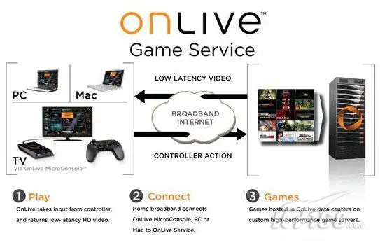 OnLive的技术是一种类似VOD视频点播的GOD(Game On Demand)游戏点播技术,所有游戏都在服务器端运行,并将渲染完毕后的游戏画面压缩后通过网络传送给用户。在客户端,用户的PC或Mac机不需要任何高端处理器和显卡,只需要基本的视频解压能力就可以了。OnLive甚至设计了一款超迷你主机,只拥有视频解压和手柄控制信号接收发送能力。