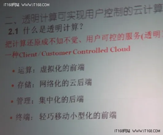 第三个,就是要做到无处不在的、不知不觉的服务,必须要把机器做得很小。就像IPad尽管可以下载很多东西,但是有小。像我们现在在互联网上看电视剧一样,在我还没看之前,就把我们的电视剧下载了,一边看后面的,一边把前面的丢掉。这样,前端机器没有这么重的负担。