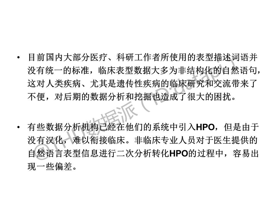国内大部分医疗和科研工作者所使用的表型没有统一的标准,且表型数据大多数是自然语言,交流很不方便,后期数据挖掘也十分困难。一些数据机构因为没有汉化的HPO词语难以将自己的系统衔接临床,这一点需要突破。