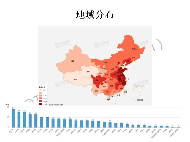 地域分布颜色的深浅代表患病人数的多少。从这张图可以看出,沿海地区就诊的人数更多,颜色浅的地区为中西部地区,可能由于医疗条件和经济水平的问题,就诊的人数较少。