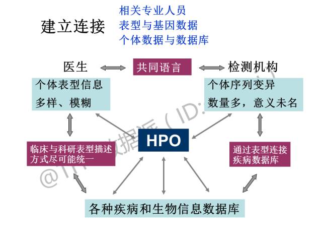 目前,医生所掌握的患者个体的表型信息与基因数据相比常常是多样的、模糊的,检测机构得到的个体序列变异数量多而意义未名,各种疾病及生物信息数据库也非常多,HPO可以作为三方的接口,让医生与检测机构或科研机构建立共同语言,使医生收集的表型信息与各种数据库信息的描述方式尽可能统一,此外有助于通过表型连接数据库更好地进行基因变异选点分析。