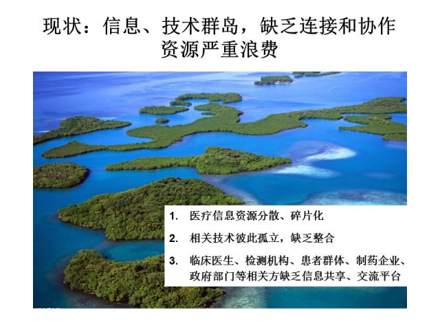 这是我自己的一些体会,信息、技术的群岛缺乏连接和合作,资源严重浪费。医疗资源分散且碎片化;相关技术之间彼此孤立,缺乏整合;医生、检测机构、患者群体、企业、政府部门及科研院校之间缺乏用于信息交流和共享的平台。