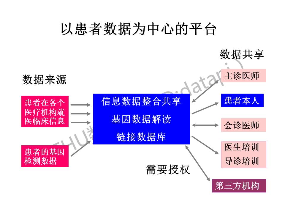 这张图是我作为医生的梦想,建立一个有序的能将信息数据整合共享的平台。以患者数据为中心,从各个机构获取的患者就诊信息、患者的基因检测数据整合在一个平台上,流程和方式仍需探索,同时患者的个人隐私必须得到保护,数据共享需要建立授权方式。