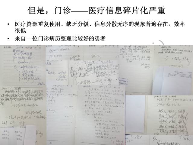 大多数医疗机构的门诊信息碎片化非常严重,医疗资源浪费严重,信息分散、无序。这是一个患者的门诊病历,其中包含着多家医院多位医生的劳动,也包含着患者及其家人多次就医的过程,但是效率很低。