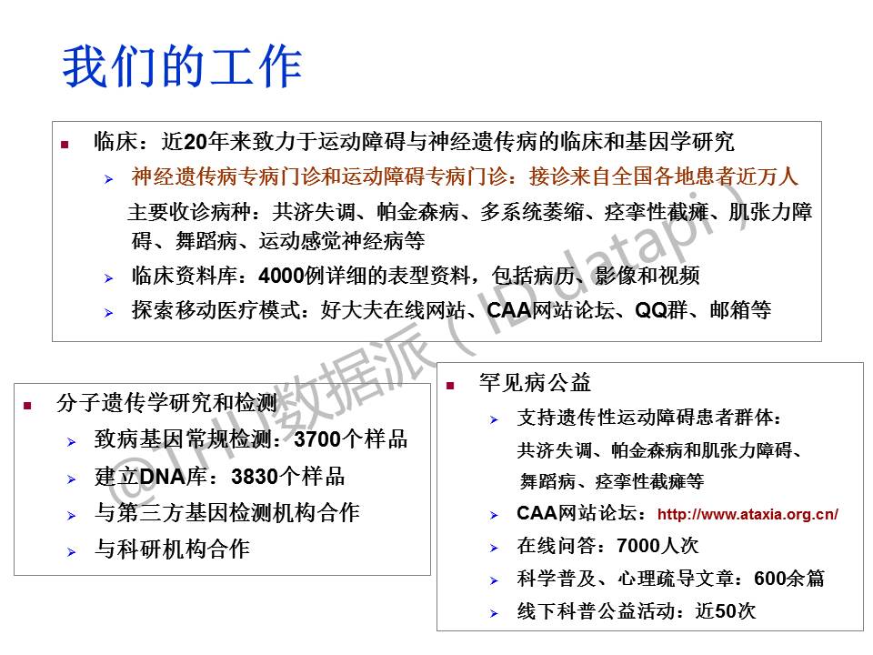 近20年来,我们通过临床和基因学研究和检测,建立了电子版的资料库,也探索了一些移动医疗模式;目前已经建立数据库,并与第三方检测机构、科研机构合作,并做了很多罕见病公益方面的工作。未来希望三者可以结合起来,整合资源,从而提高效率。