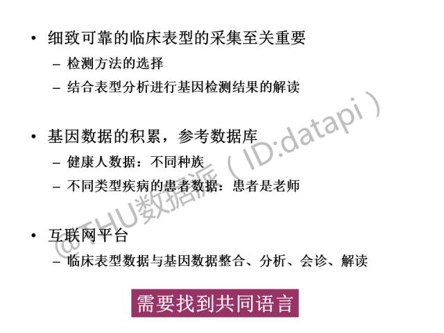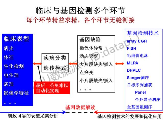然而图中这四个环节之间存在连接的问题,从左至右是细致的表型采集,从右至左则是基因检测的发展和优化应用,二者连接在一起才能进行更好的基因数据解读。这方面目前还很不完善,没有建立很好的流程,是未来的愿景。
