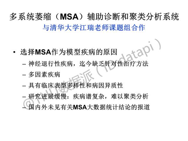 MSA辅助诊断和聚类分析系统是与清华大学江瑞老师课题组合作的一项工作,选择MSA作为模型疾病的原因主要包括:MSA为神经退行性疾病,且迄今没有针对性的治疗方法;MAS为多因素疾病且具有临床表型多样性和病因异质性;病因复杂,难以进行聚类分析;国内外并无基于表型数据库进行MSA统计的报道。