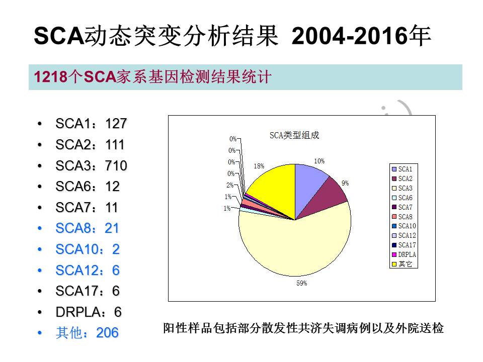在常染色体显性遗传共济失调方面,我们对基因检测确诊的患者家系数据进行分析可在一定程度上反映中国人SCA分型比例的特征。