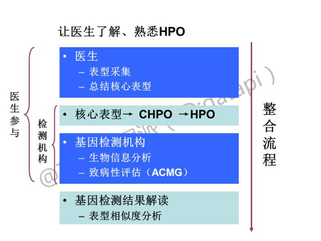 未来,需要让医生了解CHPO/HPO,在提供表型的时候进行标准化,这一点对于基因检测结果的解读也会十分有帮助。所以,需要把整个流程整合到一起。