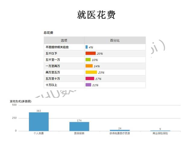 就医花费的统计上,有的患者不愿意提供相关信息,收集到的花费数据信息也从5千以下到10万以上分为不同级别,且大部分的支付方式都是自付。