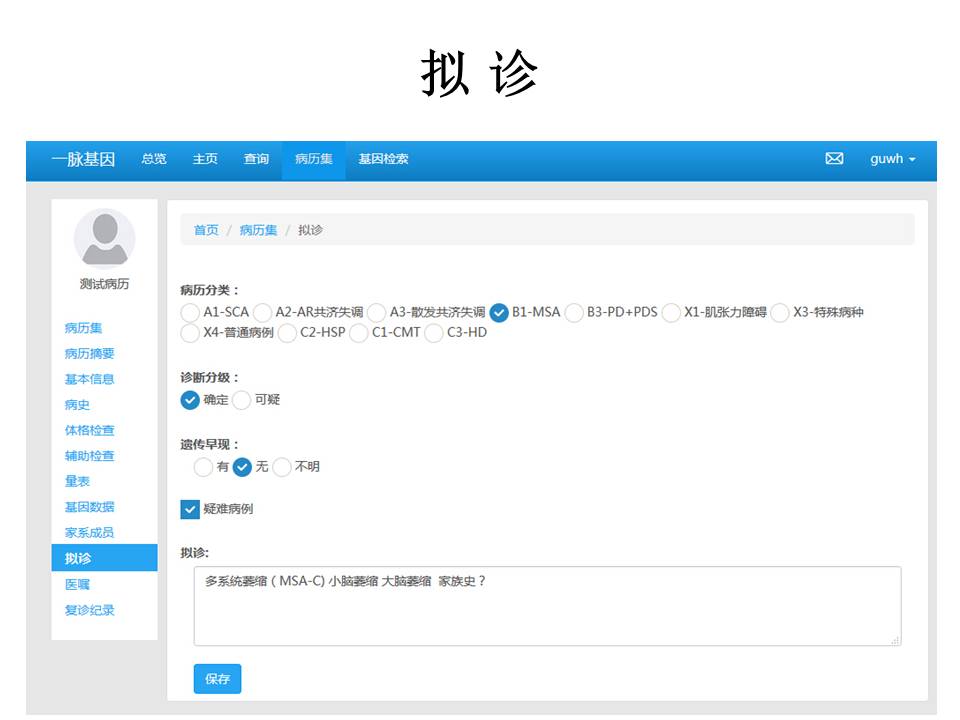 左边为数据库的导航,包括病史、体格检查、辅助检查和基因数据、拟诊和医嘱等,每个页面包含相应的采集项目,其中基因数据页面希望能够通过授权给检测机构,让他们可以看到患者的表型数据,同时上传基因数据,由医生和检测机构共同出具检测报告。
