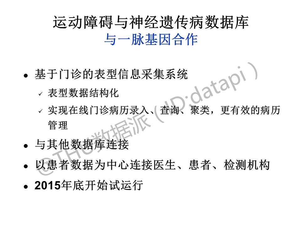 运动障碍与神经遗传病数据库是与一脉基因合作开发的,我们希望能够基于门诊进行表型信息的采集,并实现与其他数据库的链接,该数据库已于2015年年底开始试运行。