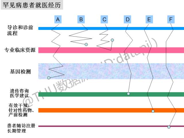 这张模式图展示了目前大多数罕见病患者艰难的就医经历。导诊和诊前流程的缺乏、专业临床资源缺乏、基因检测行业的鱼龙混杂等现象都会让大多数患者的就医停留在ABC三个阶段。