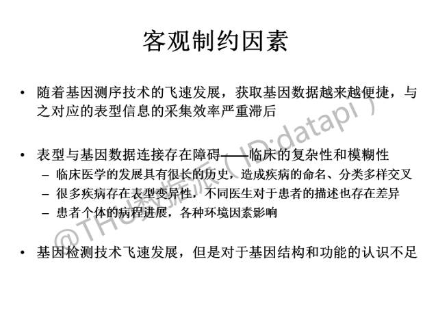其中客观的制约因素主要有:表型信息采集效率的严重滞后,由于医学发展历史的原因,疾病命名、分类的复杂交叉,疾病表型的变异性及各种环境因素影响下患者病程进展的不可控等。此外,基因检测技术虽然在飞速发展,但我们对基因的认识仍然不足。
