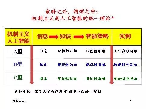 在机制主义人工智能框架里,A、B、C型不只是特例,A型可以转化为B型,A、B型可以转化为C型。因为经验性知识可以提炼成规范性知识,这两种知识可以普及沉淀成常识性知识。