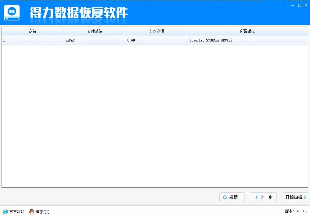 3、运行得力数据恢复软件,出现下面界面。 如果您的U盘已经连接电脑,列表框会显示您的U盘,鼠标左键点击您的U盘,然后点右下角的“开始扫描”。