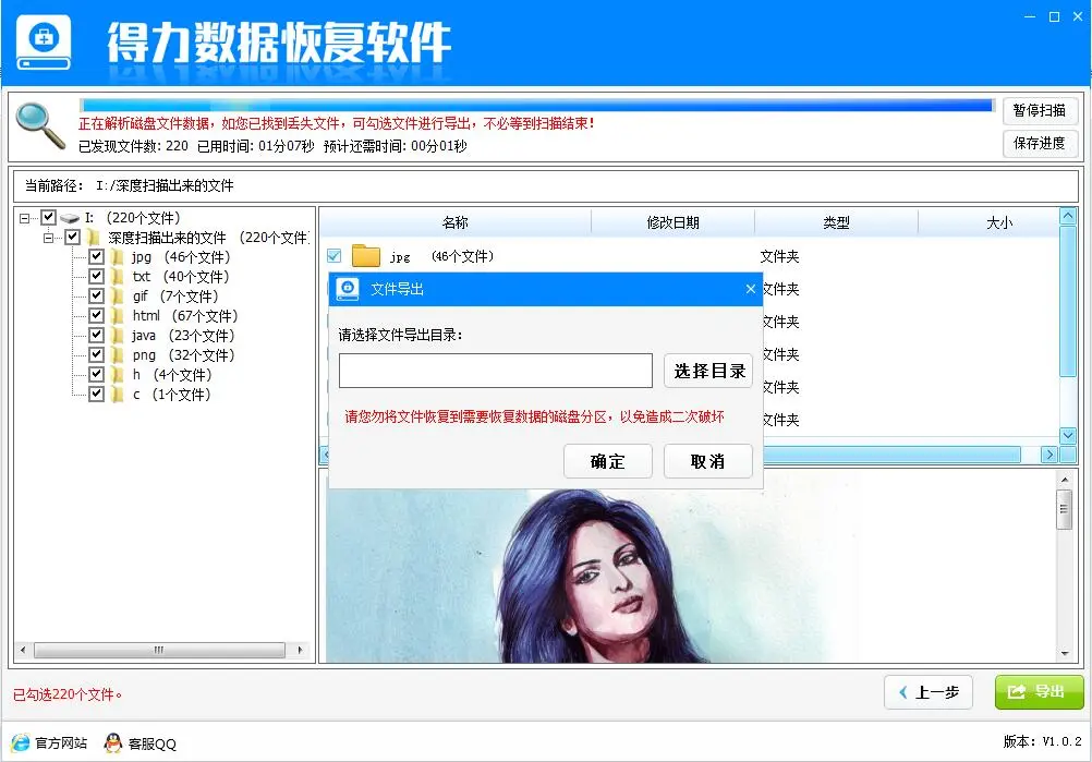 5、扫描结束,下图是分析的结果。 勾选需要的文件,点右下的导出按钮即可导出选中的文件。点"选择目录"按钮,选择导出目录,请选择您的电脑硬盘。
