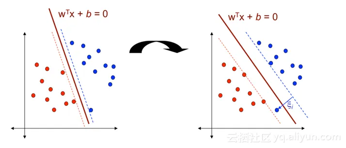 在上面的数据类中,有一个蓝色的异常值。如果我们对该数据集应用硬间距分类器,我们将获得左边图所示的小边距的决策边界。为了避免这些问题,最好使用更灵活的模型。目的是在保持两条线之间距离尽可能大的情况下找到一个良好的平衡,并限制边际违规(即,最终在两条线中间的距离甚至错误的一面的情况),这称为软间距分类器。如果我们对该数据集应用软间距分类,我们将获得比硬间距分类更大的确定边界,这在右图中显示。