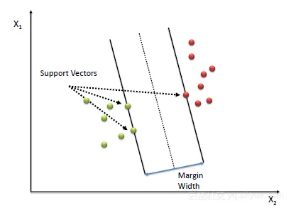 这两个类数据可以用直线(线性分离)轻松分离。左图显示了2个可能的线性分类器的决策边界。SVM模型其实就是关于生成正确的分界线(在较高维度称为Hyperplane)。在左图中,我们可以看到数据分类非常好,尽管红线对数据进行了分类,但在新的数据实例中可能无法很好地执行。我们可以画出许多对这些数据进行分类的线,但是在所有这些线中,蓝线可以分隔最多的数据。如果将相同的蓝线显示在右图,这条线(超平面)不仅分离了两个类,而且还保持了最远的相近的训练实例的距离。我们称之为大间距分类器(Large Margin Classification)。