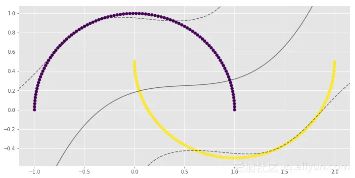 添加多项式特征非常简单。但是低度多项式不能处理复杂的数据集,并且具有较高的多项式度将会产生大量的特征,使得模型太慢。在这种情况下,我们可以使用多项式内核来避免这个问题。多项式内核具有以下格式: