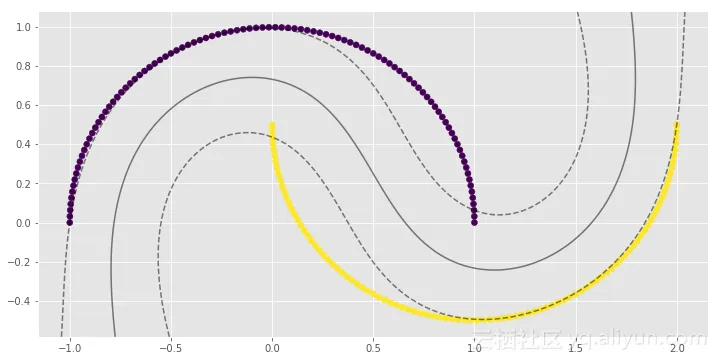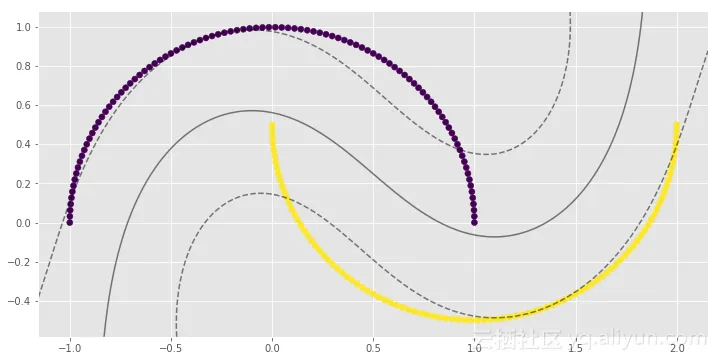γ参数对RBF SVM模型非常重要。在第一个例子中,γ的低值导致非线性分类几乎接近线性分类。