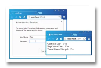 由于浏览器默认提供对Basic认证的支持,所以当我们运行该程序后如下图所示的登录对话框会自动弹出,当我们输入正确的用户名和密码(用户名和密码直接维护在AuthenticateAttribute上)后,当前登录用户名会呈现在浏览器上。