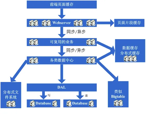 经过这一步,差不多系统的架构进入相对稳定的阶段,同时也能开始采用大量的廉价机器来支撑着巨大的访问量和数据量,结合这套架构以及这么多次演变过程吸取的经验来采用其他各种各样的方法来支撑着越来越高的访问量。