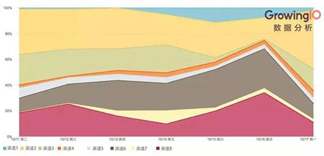 「百分比堆积图」动态显示了不同渠道比例的变化趋势,市场或者运营人员可以据此动态优化我们的资源投放。
