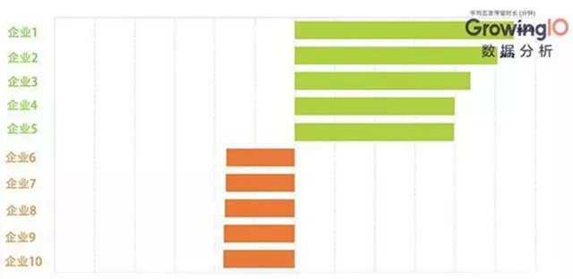 上面的双向条形图展示了某 B 端产品的客户平均停留时长极端情况(非常高和非常低),企业 1-5 非常活跃,可以让运营人员促进客户增购、续约,而企业 6-10 活跃度非常低,用户即将流失,需要运营人员立刻介入干预。