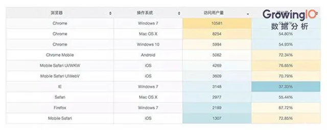通过表格不难发现,移动端访问用户占了非常大的比例,但是跳出率非常高。这样的表格数据启示我们有必要优化移动端产品,提升整体访问深度。
