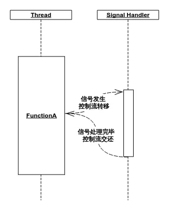 UNIX 信号处理是一个相当奇葩的过程——当进程收到一个信号时,内核会选择一条线程(以一定的规则),中断其当前控制流,将控制流强行转给信号处理函数,待其执行完毕后再将控制流交还给原线程。时序图如下: