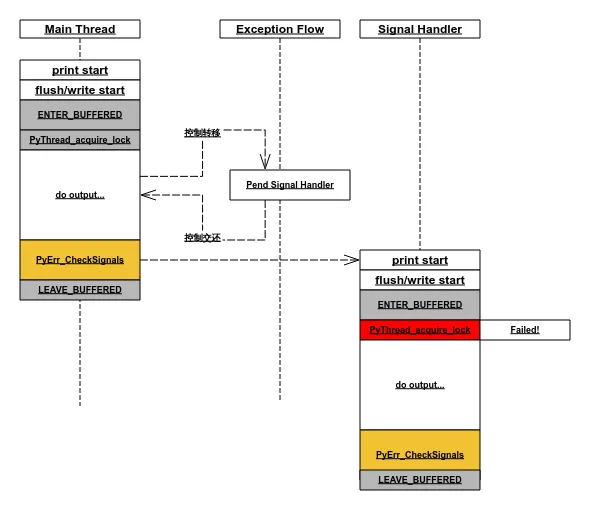 当信号中断发生在 _bufferedwriter_flush_unlocked 或 _io_BufferedWriter_write_impl 中时,这两个函数中的 PyErr_CheckSignals 会直接唤起 Python Signal Handler,而此时由 ENTER_BUFFERED 上的锁尚未解开,若 Python Signal Handler 中又有 print 函数调用,则会导致再次 ENTER_BUFFERED 上锁失败,从而抛出异常。时序图如下: