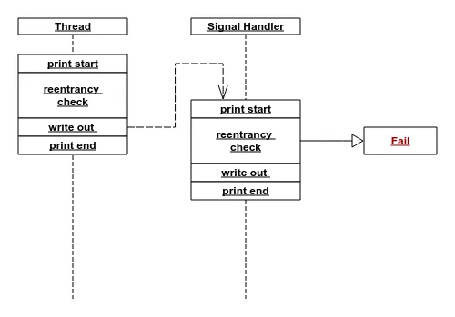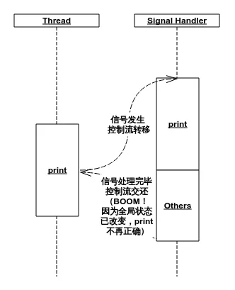 由于控制流转换发生在同一条线程上,许多线程间同步机制会失效甚至报错。因此信号处理函数的编写要比线程函数更加严格,对同一个文件输出是被禁止并且无解的,因为很可能会发生这样的事情: