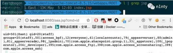 将以上 JSP 文件上传至目标服务器命名为 n1ntyfilter.jsp,访问后如果看到“injected” 字样,说明我们的过滤器已经插入成功,随后可以将此 jsp 文件删掉。随后,任何带有 cmd 参数的请求都会被此过滤器拦下来,并执行 shell 命令,达到“看不见的 shell”的效果。