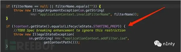 但是并没有简单到直接调用一下这可以实现,因为 Tomcat 在对这个接口的实现中,是只允许在容器还没有初始化完成的时候调用这几个方法。一旦容器初始化已经结束,调用时就会出现异常: