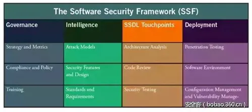 软件安全框架(Software Security Framework,以下简称为SSF) 是BSIMM赖以成型的基本结构,如上图所示,它为各种安全活动提供了一个通用的词汇表,来解释"软件安全举措"中的主要要素。