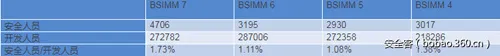 加入BSIMM社区的安全人员和开发人员对比的详细数据如下表所示: